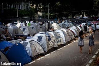 Las protestas populares y de masas que aquí comenzaron como un grito de rabia contra el precio de la vivienda han evolucionado admirablemente en una protesta pública contra una serie de problemas muy arraigados en la vida social y económica de Israel. Visitando los campos de las tiendas temprano todos los días, hemos visto crecer la protesta de un grupo variopinto de Woodstockers, ilusionados, en la punta del bulevar Rothschild hace dos semanas, a una especie de mini-metrópoli cerca de la final de la carretera. La primera tienda es de Médicos por los Derechos Humanos , «Resolver el Negev y el Galil», tiendas de campaña, discusiones ideológicas, guitarra y tambor mientras se canta a coro, Kabalat Shabat, cena de viernes por la noche, cine al aire libre sobre temas revolucionarios, familias con bebés, y consignas infinitamente creativas. Hay tiendas de campaña hasta cerca de la estación central de autobuses, en un juego del gato y el ratón con el municipio, que está tratando de romper su campamento.