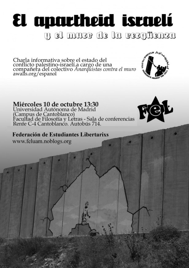 Desde la Federación de Estudiantes Libertarixs (FEL) de la UAM tenemos el placer de invitaros a participar en una charla acerca del conflicto palestino-israelí a cargo de una compañera del colectivo “Anarquistas Contra El Muro”*. Será una buena oportunidad para conocer de la mano de una persona que lo vive en primera persona y es su día a día la realidad del pueblo palestino y su resistencia contra las agresiones externas.