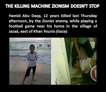 Today I write this story of the murder of the child Hamid at the hands of the killing machine Zionism, while playing football, a child football fan and supporter of Real Madrid. The story is going to help us by know it closely: first the tragedy of the Palestinian people to be threatened and the continued implementation of this killing machine called «Israel», managed by the Sion-Monster from his cave. And secondly, to determine the degree to which it has come dehumanized the Godmother of the State by not taking a single action against him, on the contrary, a few days ago the European Union, its leaders fill their mouths talking about human rights signed a special treaty with that State trading murderer.