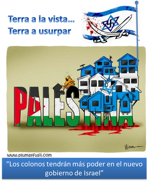 Terra a la vista… Terra a usurpar… Se le oye gritar al colono al que su partido tendrá en su mano la cartera de vivienda y asentamientos, el llamado Naftali Bennett, ahora toca poner a los ultraortodoxos fuera de la sala de máquinas, y mandarlos a fregar cubierta y de centinelas, por mandato político de los que han conseguido más votos apoyando la idea de que los religiosos judíos han de cumplir también el servicio militar ¡Cambio de papeles! Naftali Bennett se frota las manos al ver el tesoro que las nuevas tierras esconden en sus colinas y valles fértiles, para su proyecto de alcanzar en esta legislatura el millón de colonos en Cisjordania ocupada. Necesita que haya más soldados para mantener y aumentar el dominio ocupado, les será de utilidad que los ultraortodoxos lleven junto a sus rosarios un fusil, de ese modo cumplen con el dicho: “a Dios rogando y con el mazo dando” o mejor dicho con el fusil matando palestinos.