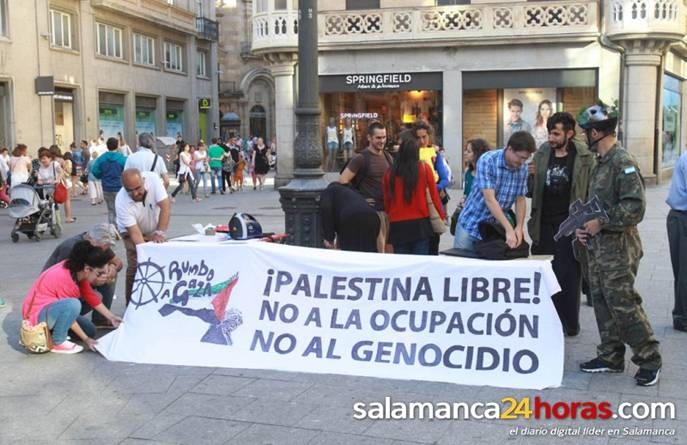 Se cumplen diez años de la declaración de ilegalidad del muro construido por Israel, en pleno conflicto en Gaza. Activistas salmantinos han escenificado su protesta este miércoles en la plaza del Liceo