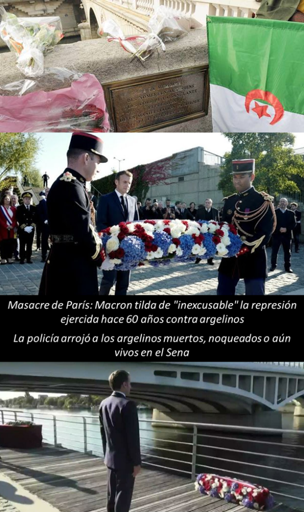 En otra parte y para atraer a la memoria algún episodio más cercano en el tiempo, puse en manifiesto la lucha por la liberación, con la gran matanza del 17 de octubre 1961 en París, cometida por la policía francesa contra una manifestación pacífica, convocada por el Frente de Liberación Nacional Argelino, que desembocó en una represión brutal causando entre 300 y 400 muertos según los investigadores.