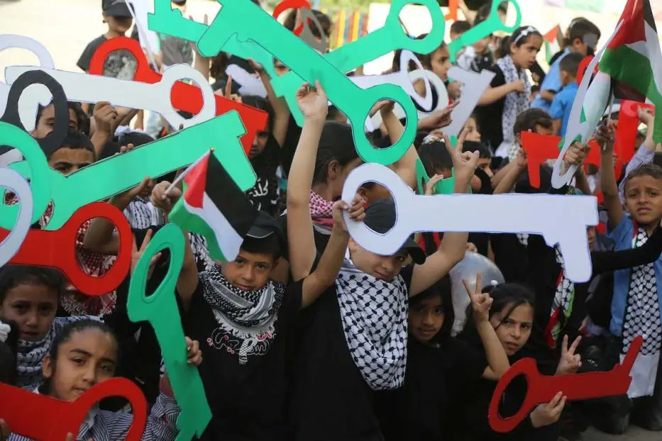 المفتاح يرمز إلى النكبة (النكبة الفلسطينية في أيار / مايو 1948) التي سحق فيها المستعمرون اليهود الأوروبيون، بدعم من القوى الغربية، المقاومة البدائية والبطولية للسكان الفلسطينيين والعرب الذين ثاروا ضد خطة الأمم المتحدة الظالمة (التي تُسيطر عليها القوى الاستعمارية) عام 1947. تمثلت هذه الخطة في تقسيم فلسطين إلى قسمين (56٪ من الأراضي لـ 300.000 يهودي وصلوا حديثًا و 44٪ لمليون فلسطيني، أهل البلد). أعلن اليهود من جانب واحد تأسيس دولة إسرائيل التي اعترفت بها القوى العظمى على الفور، وخاصة القوى الأوروبية، المستفيدة الحقيقية. بذلك حققوا هدفاً مزدوجاً وغير أخلاقي: من جانب التخلص من يهود أوروبا، ومن جانب آخر إنشاء دولة شرق أوسطية تعمل كحاملة طائرات برية لحماية مصالحهم، بالضبط كما اعترف بذلك رئيس الوزراء الإسرائيلي إسحاق رابين بنفسه. وهكذا، أصبحت الغالبية العظمى من الشعب الفلسطيني لاجئين بين عشية وضحاها