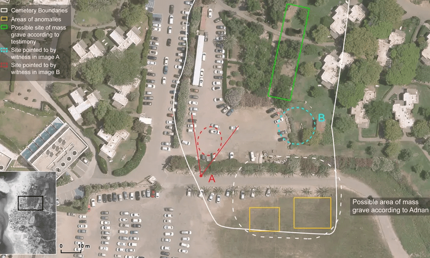 Forensic Architecture, con sede en Goldsmiths, Universidad de Londres, analizó datos cartográficos y fotos aéreas de la era del mandato británico, con referencias cruzadas con testimonios de testigos oculares de archivo y recién recopilados de sobrevivientes y perpetradores y registros del ejército israelí. Los datos se usaron para crear modelos 3D que determinaron los sitios probables de ejecuciones y fosas comunes, así como los límites de los cementerios existentes anteriormente, y si alguna tumba pudo haber sido exhumada o eliminada.