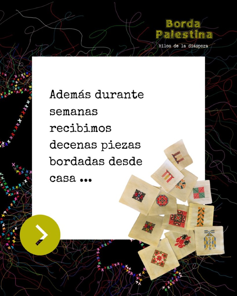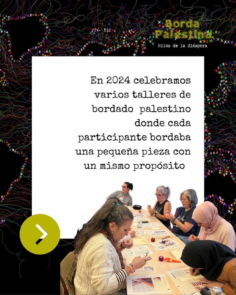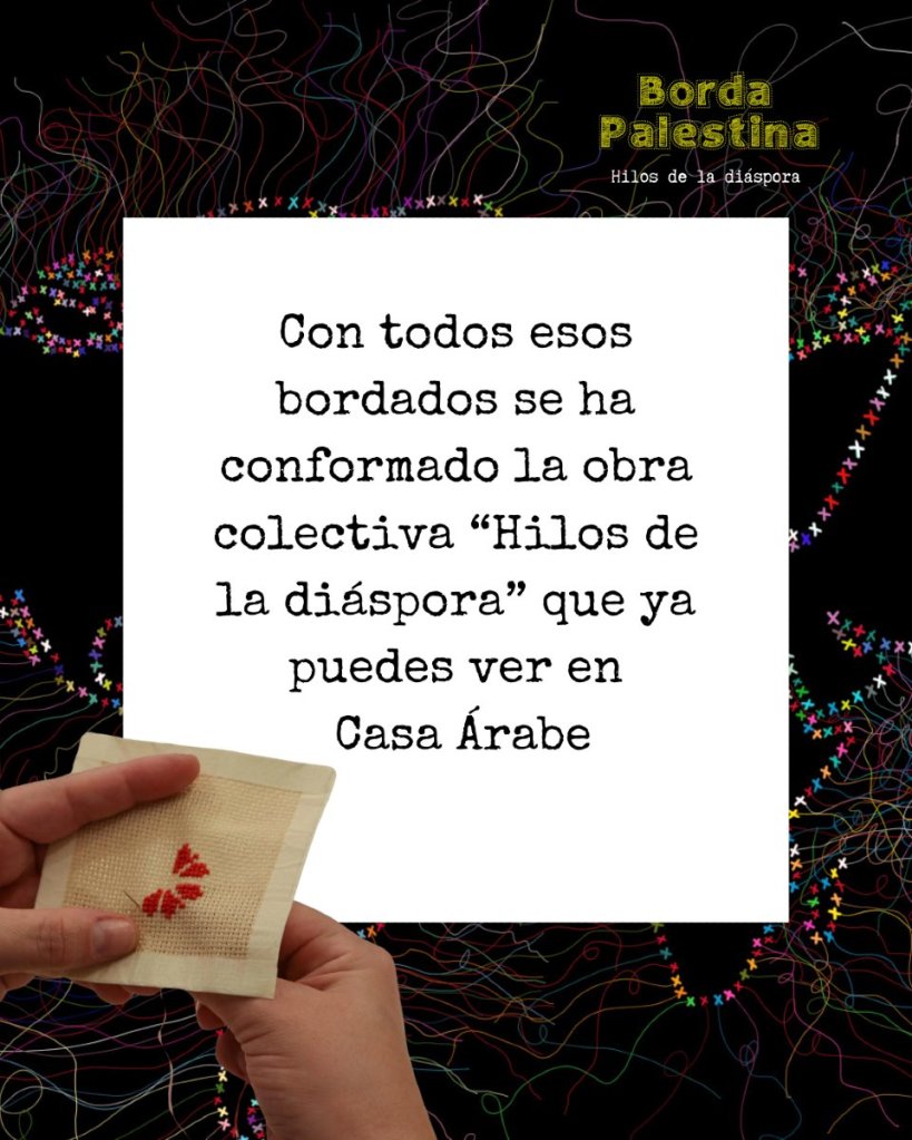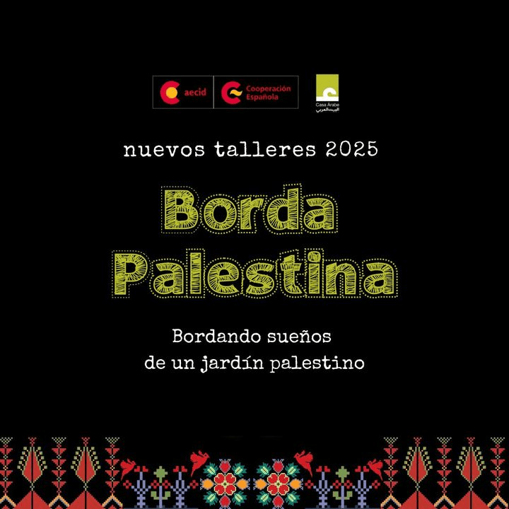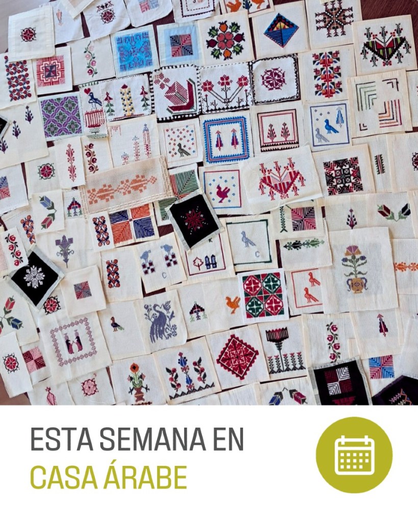 Casa Árabe vio en este elemento de tramado de hilos, artesanal y colorido que fascina a propios y ajenos un punto de partida, lo que le sugirió crear unos talleres a través del proyecto «Hilos de la diáspora. Tejiendo retazos de patrimonio palestino» de bordado inspirados en esa ancestral tradición palestina. Dichos talleres ideados por el equipo directivo y dirigidos extraordinariamente por Olivia Orozco han ido creando muestras de bordado a lo largo de muchos meses, hechos por personas que se apuntaron a participar en este proyecto solidario para con el pueblo palestino, hasta convertirse en representante del producto cultural palestino en España. Sin olvidarnos de los cursos «Pasos por Palestina. Dabke desde la Diáspora» Baile típico del Levante árabe.