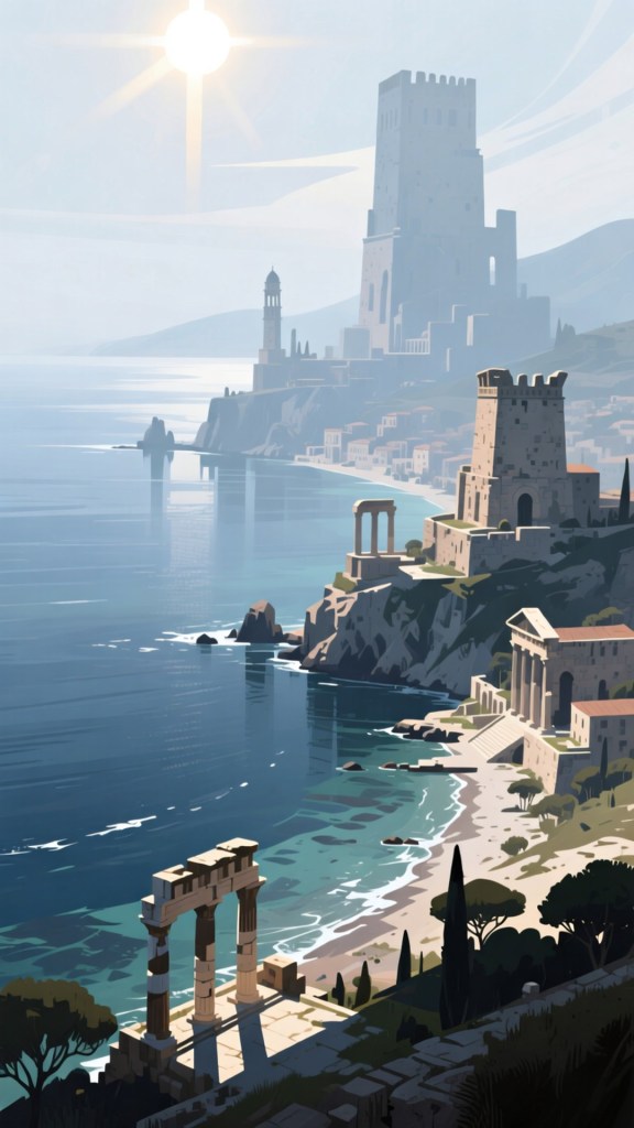 El Mediterráneo se presenta como un ser consciente que vive al ritmo de las culturas que lo rodean. Es un testigo eterno de la historia, uniendo Oriente y Occidente a través de sus aguas.