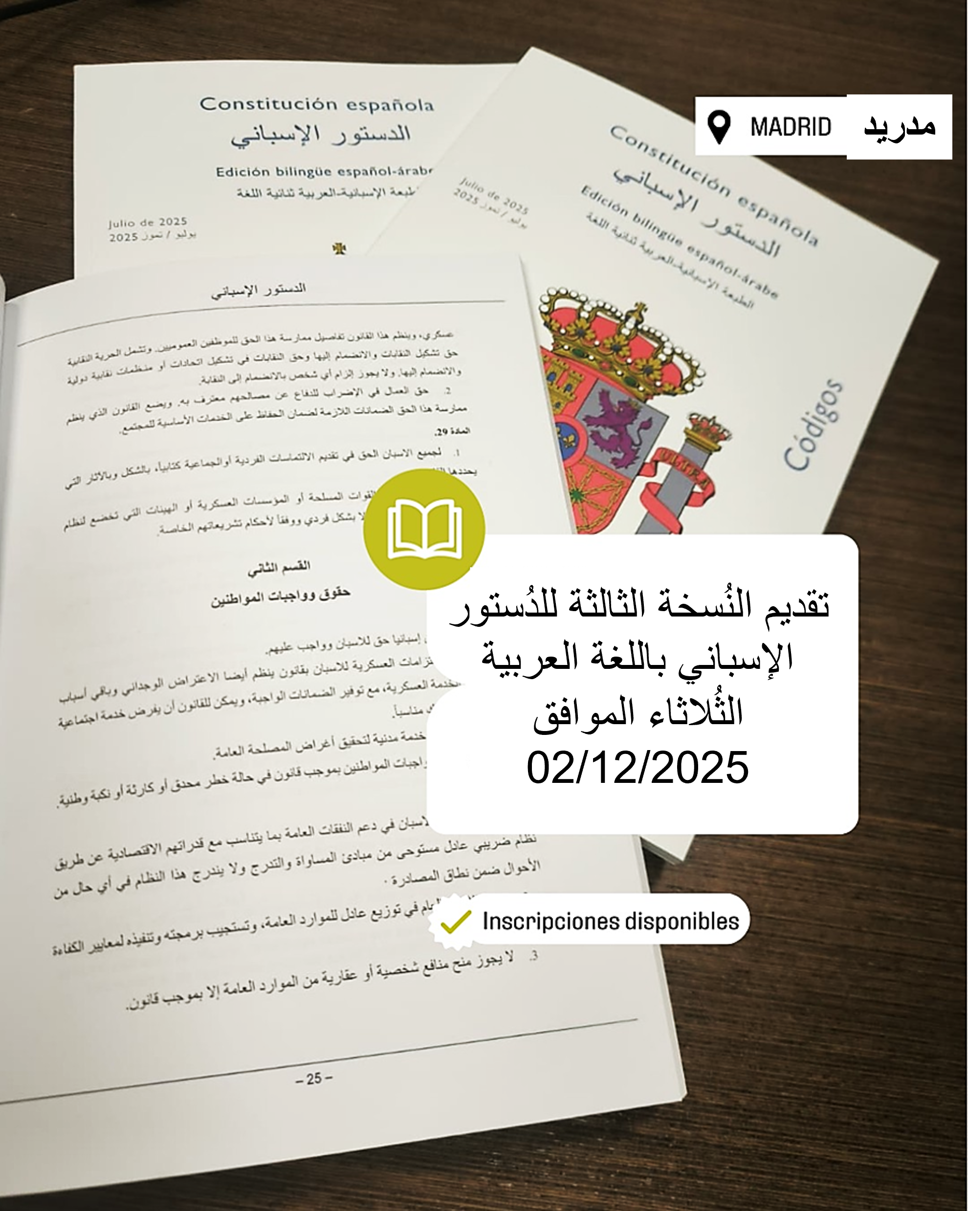 يوم الثُلاثاء الموافق 2025/12/02، تم تقديم النُسخة الثالثة للدُستور الإسباني باللغة العربية والتي راجع المُترجمون بها جميع الخواص اللغوية للنسختين السابقتين، والتي تم إعدادها من قِبلْ: إدارة النشرة الرسمية للدولة الإسبانية والبيت العربي ومدرسة المترجمين في طُليطله وهي أقدم مؤسسة أكاديمية في أوروبا للترجمةِ والتي أُسِست عام 1085